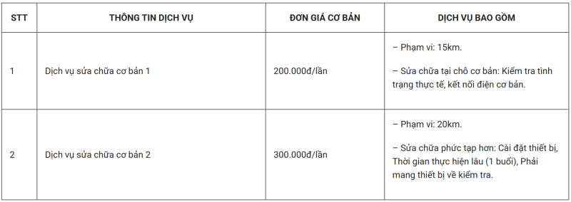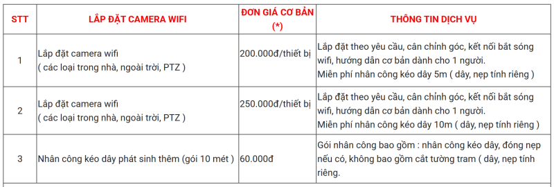 GIÁ DỊCH VỤ LẮP ĐẶT CƠ BẢN.